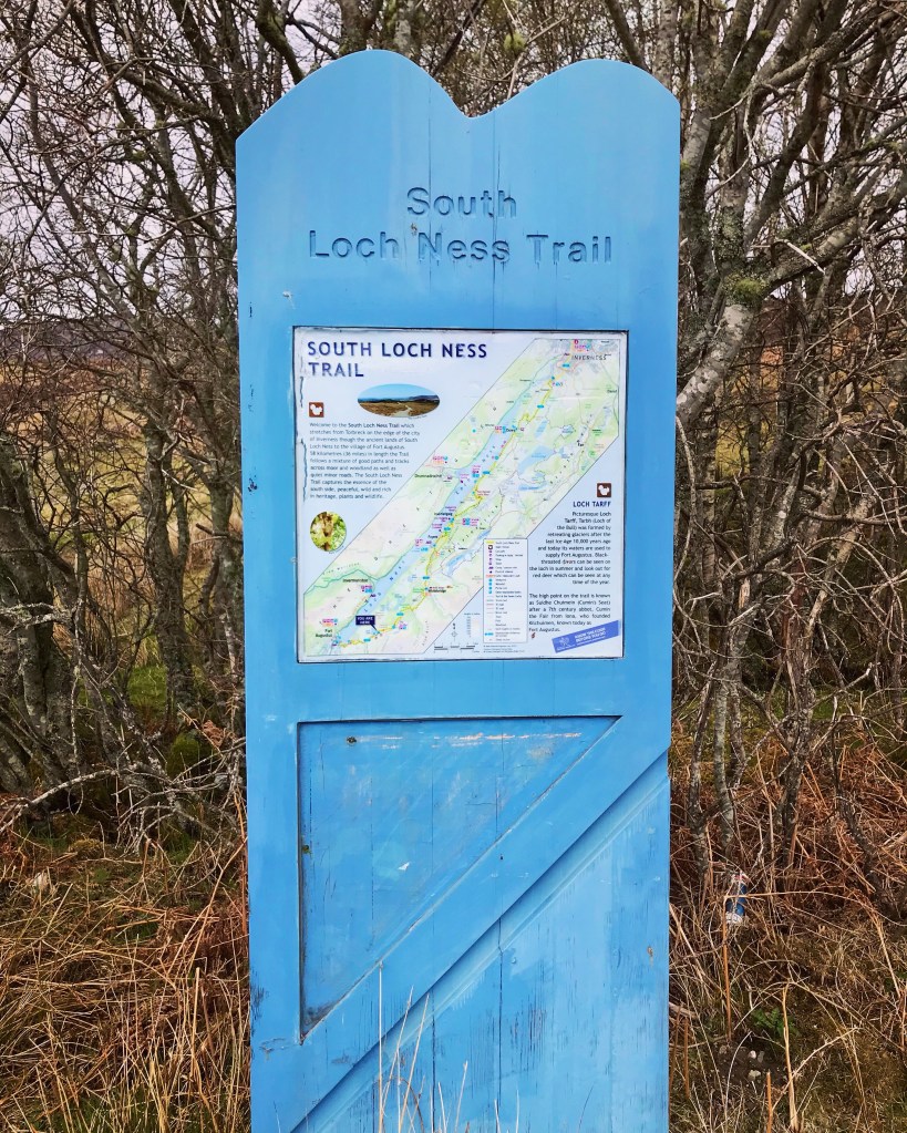 It is at this point that the Loch Ness 360 Trail leaves the Great Glen Way which turns right at the bridge and continues along to Neptune’s Staircase and follows the Caledonian Canal. My route required me to continue over the bridge and follow the General Wade’s Military Road right through the village before crossing another bridge running over the River Tarff and arriving at a small gate leading through an open field at the shoreline of Loch Ness. From this point on, I was on the official trail route of the Loch Ness South Trail which is identifiable by a blue marker with a black squirrel symbol.