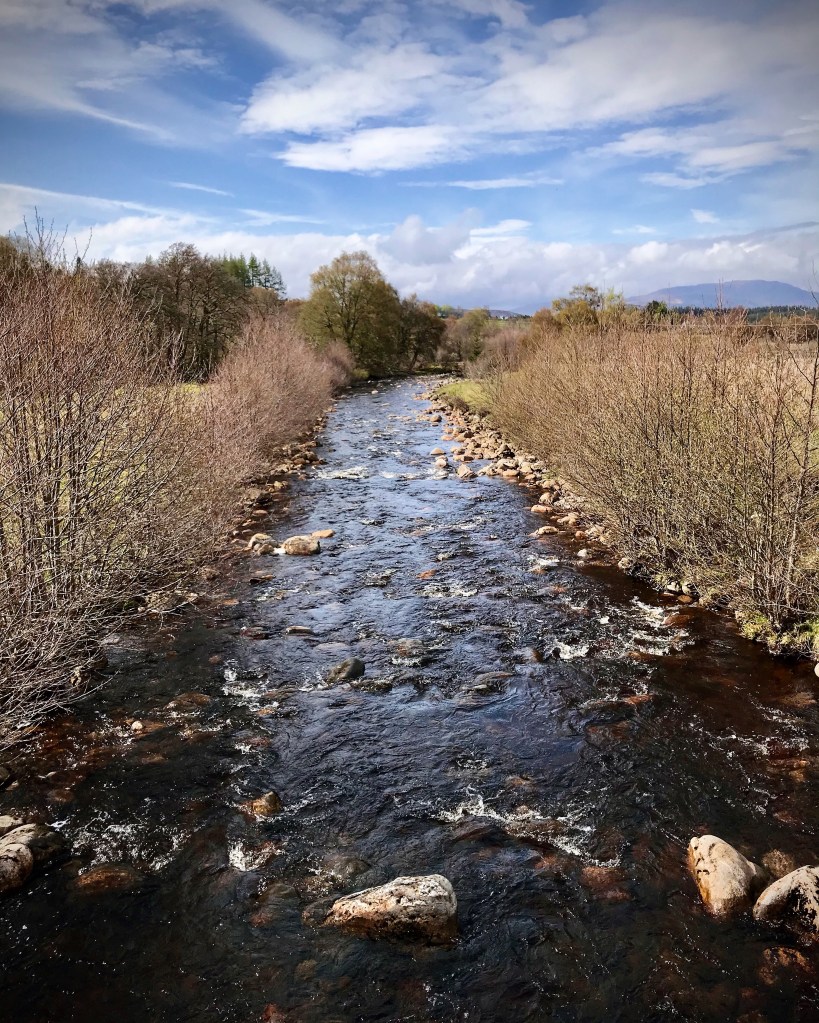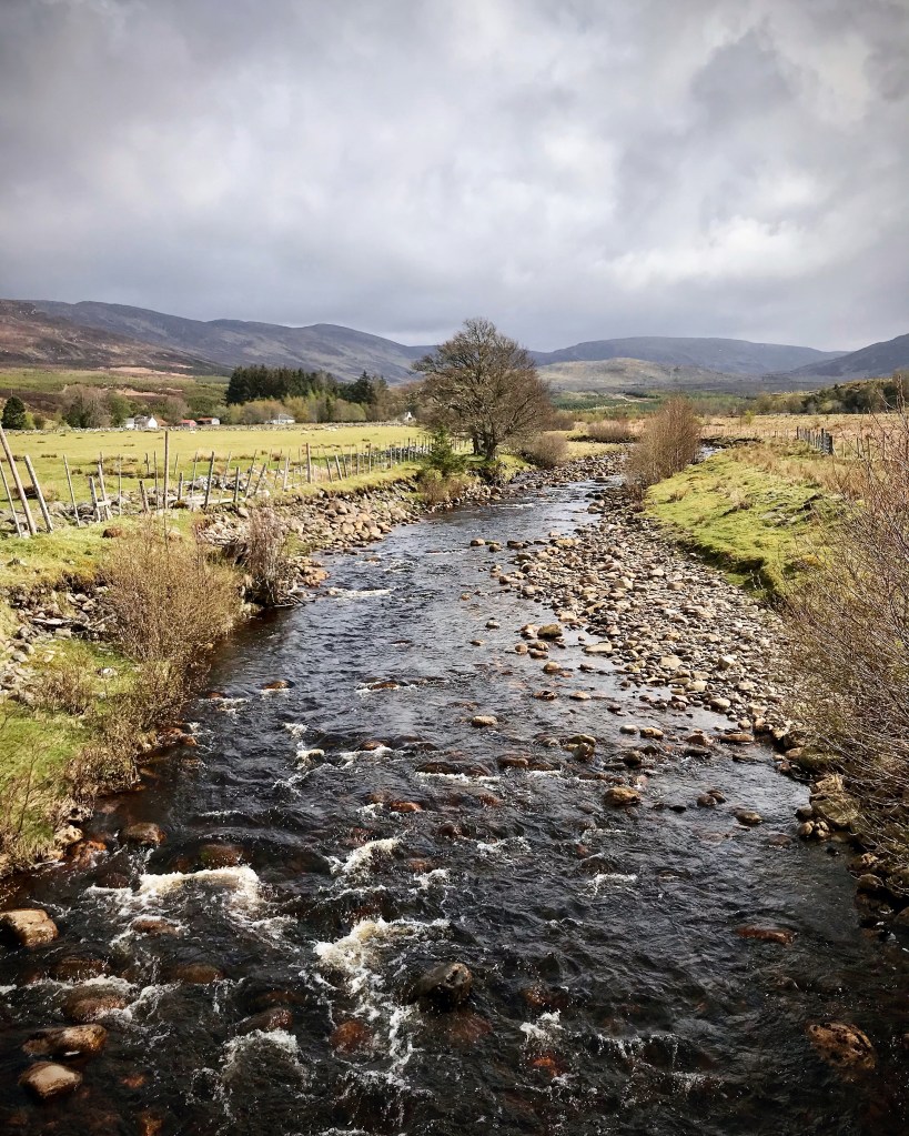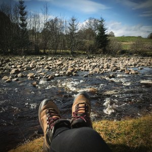 After following the dry asphalt road for a while, the trail eventually meets up with the Knockie Road, a long, single track lane with passing places which leads right the way to the General Wade’s Military Road. Crossing over to the opposite side, the trail continues off to the right through open fields towards the first of two large rivers, the Cumrack Burn and the Allt Breineag, the latter having to be crossed via a large wooden footbridge. Immediately upon crossing, the footpath turns sharp left and continues parallel to the river. Eventually I reached a place where the ground levels off towards the waters edge and there was a beautiful spot with short, soft grass. The perfect rest spot! I stayed here approximately 20 minutes while I heated some water for a coffee and relaxed taking in all my surroundings. What a beautiful day this was turning out to be. It was approximately 3pm and the sun was out shining in full force.