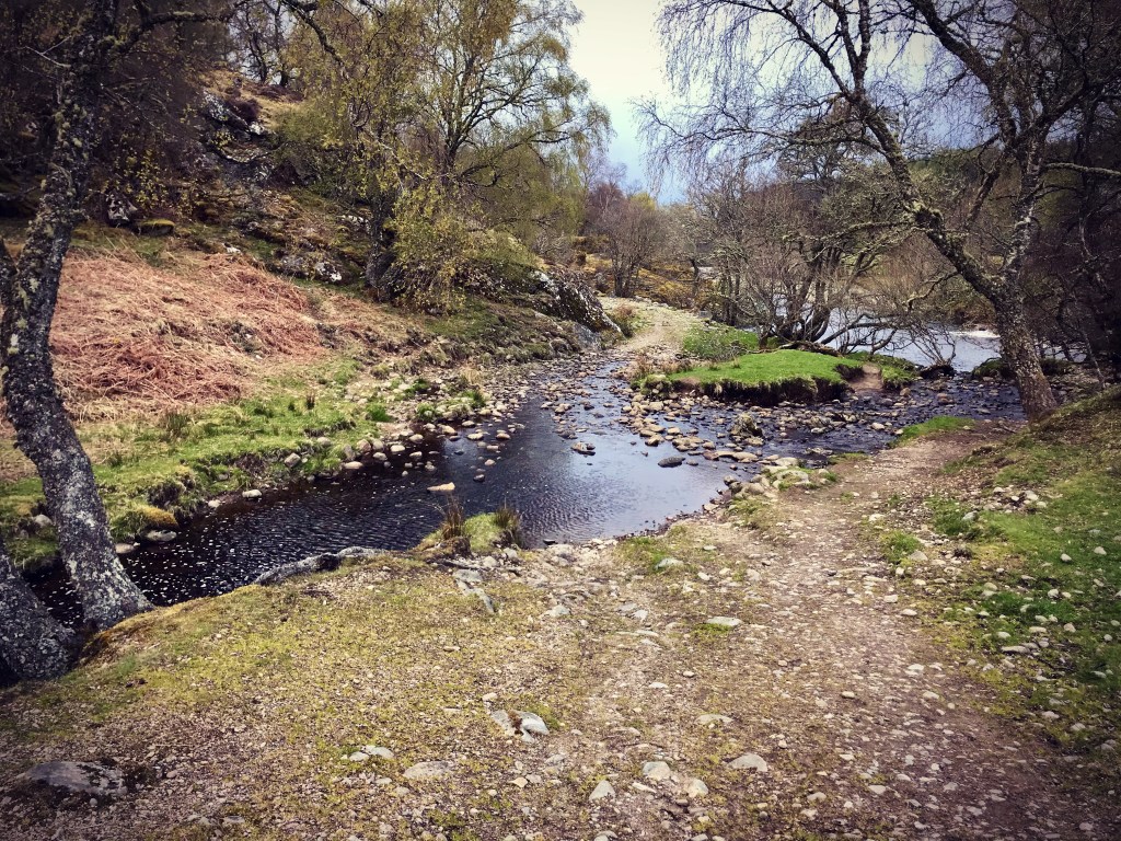 After leaving the bridge and heading back towards the hotel at Whitebridge, the trail crosses the General Wade’s Military Road and begins to head along a straight and narrow country lane running parallel to the River Fechlin which eventually joins an estuary becoming the River Foyers.