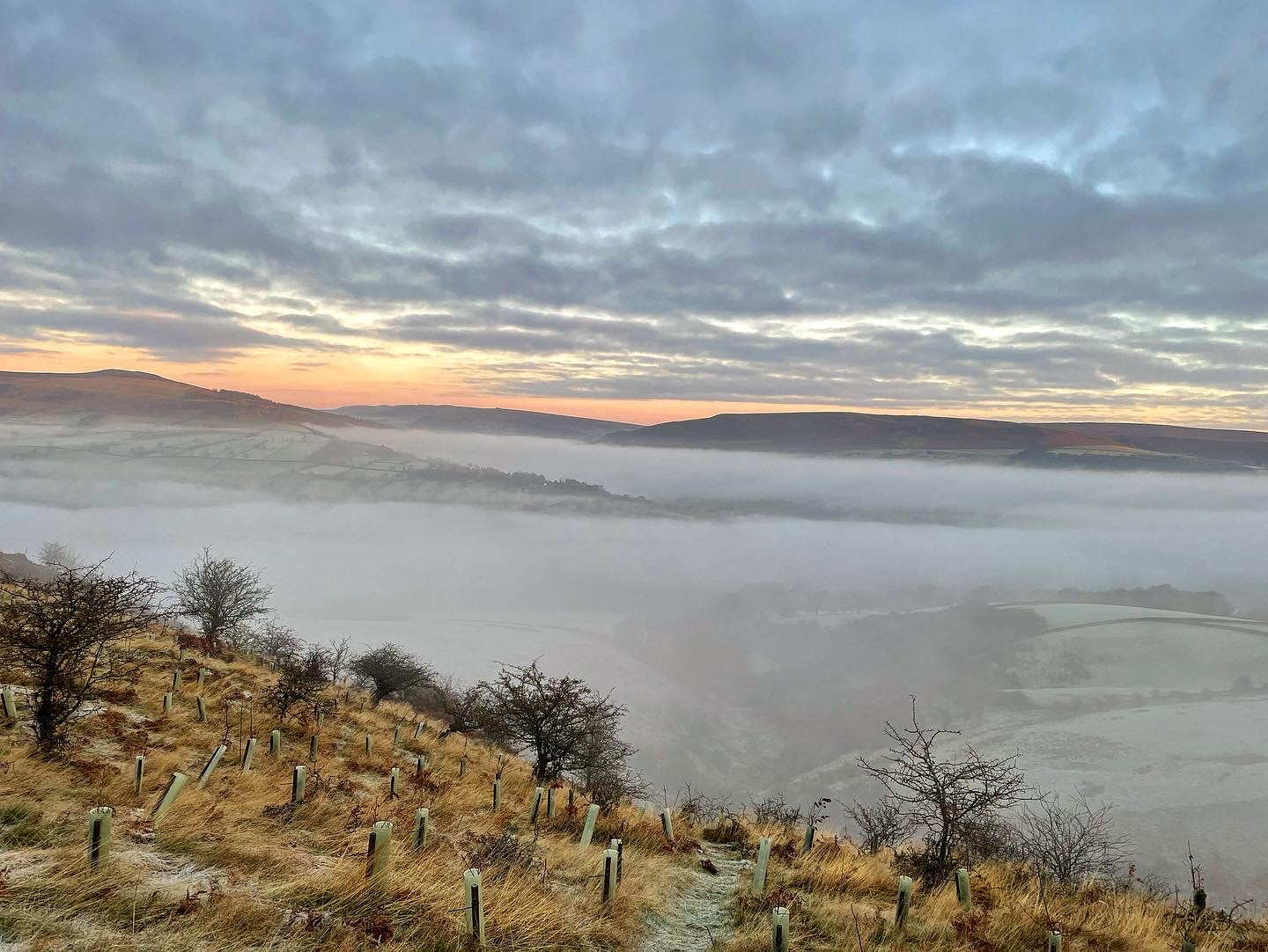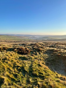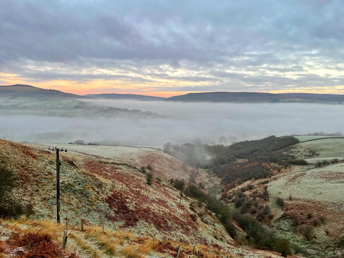 It wasn’t long before my turn off appeared, a little footpath on my right leading downwards through a gate and into grassy and uneven terrain. I was just starting to sense the daylight breaking through the clouds as I reached the bottom and looked for the footpath which would take me up onto Shatton Moor. How strange though that it wasn’t there…. I consulted my Strava GPS again and it clearly showed a footpath but no matter how hard I searched, it wasn’t to be found. The way it directed me was through a small grassy gully heading uphill and following the contours of the hills before climbing steeply up to the top. The frost on the grass was at its thickest here and my feet definitely felt the chill seeping through as I climbed over huge tufts and mounds. The sides of the steep gully were slippery in parts and made the climb difficult but I could see the landscape becoming lighter with every minute that passed. Dawn was finally upon us and I felt relief that it wouldn’t be dark for long.