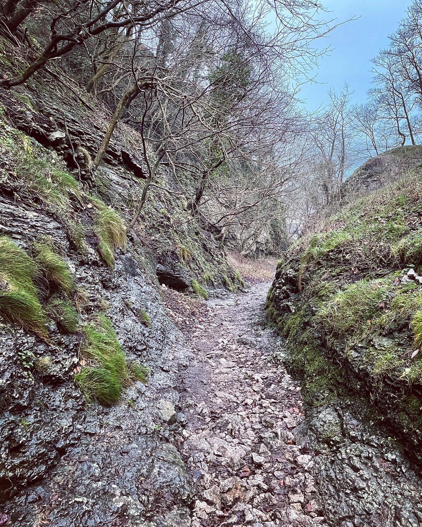 The following section of trail down through Cave Dale on the very outskirts of Castleton was probably the most treacherous descent I have ever attempted. Care has to be taken to find decent footing at the best of times but during winter months it was particularly hard going. I remember walking up this route in the summer of 2006 whilst on a day trip and I couldn’t help but smile at the memory of myself and friends scrambling up the limestone crags to reach the summit before descending the opposite side towards Peak Cavern aka Devil’s Arse. Now as I stood for a brief moment staring down through the gateway at the top I couldn’t believe the transformation. How different the conditions were now! That summers day in 2006 had been so easy underfoot that we had got away with wearing trainers, the only hazard being the occasional tiny white limestone which entered our socks and proceeded to cause maximum discomfort when we least appreciated it. On this day in December 2021, the steep pathway reminded me of a trickling brook which tumbled down over the polished rocks, it’s waters tinged with mud and ice which had formed like a film over the rocks surface. Any step could’ve resulted in a fall and a nasty end to my day if I hadn’t taken my time as I lowered myself from the crags as carefully as I did.