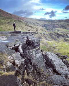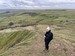 Heading across open pasture land, we followed a footpath over towards the top of Winnat’s Pass where there is the opportunity to walk down the Pass on the side of the road but where would the fun be in that? Our intention that day was to head up onto the far crag and walk the length of Winnat’s Pass taking in the spectacular scenery with almost an aerial view. The climb up in the wind and mud was definitely an obstacle and it did involve using our hands to hold on and lots of taking four steps forward and two steps back but we eventually reached the top.