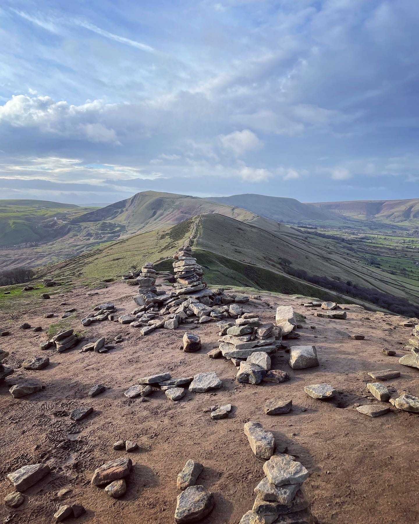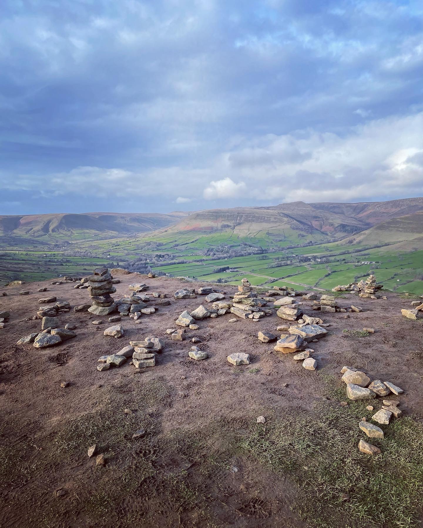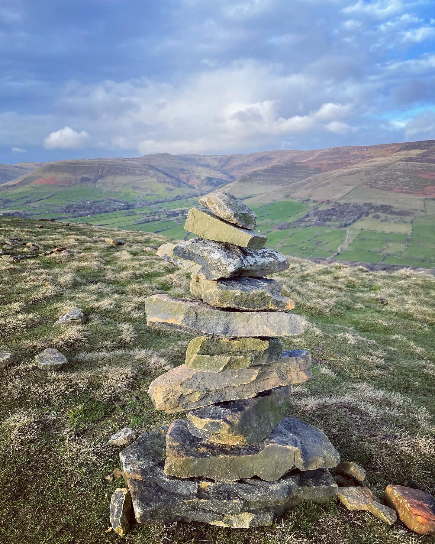 Dotted along the summit of Back Tor are many cairnes which have been gradually built or started off by fellow hikers. Although attractive to view, cairns are built for many purposes and date back to prehistoric times. Modern cairns like the ones on top of Back Tor are usually built as a friendly gesture for fellow hikers, a tradition being that one stone or rock be added to create a stack or pile. As the stack grows taller overtime, they can become way-markers for a specific route. Many can also symbolise burial spots and warn of possible danger. It is customary to spot cairns where there is a sheer drop down from a cliff face or crag as is the case at Back Tor.
