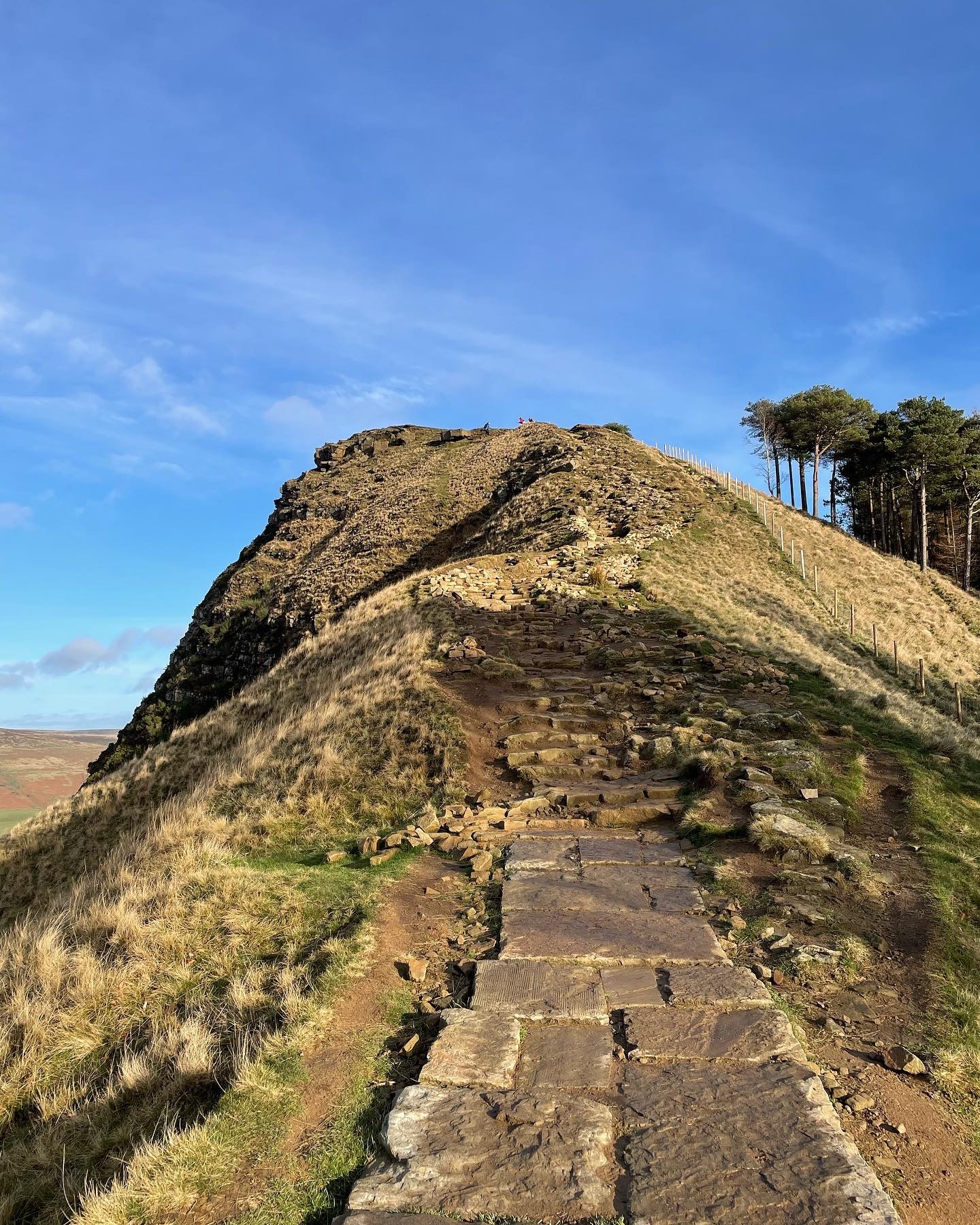 Continuing onwards after the descent of Back Tor the pathway heads towards Hollins Cross where a cylindrical pillar marks the spot. The paved pathway running the length of the Great Ridge has undergone extensive path repairs throughout the spring and summer month of 2021. During this time whilst the work was being carried out, the path had been closed off to the public. Over the years and due to wear and tear from the many tourists who frequent the location, the stonework had worn away and began to crumble and fall down the hillside making the walk dangerous. As I walked along the recently opened pathway that day, I remember feeling extremely grateful that the work had been carried out. An absolutely fabulous job had been done in maintaining the route and it meant that we as hikers could continue to enjoy the Great Ridge in safety for many years to come.