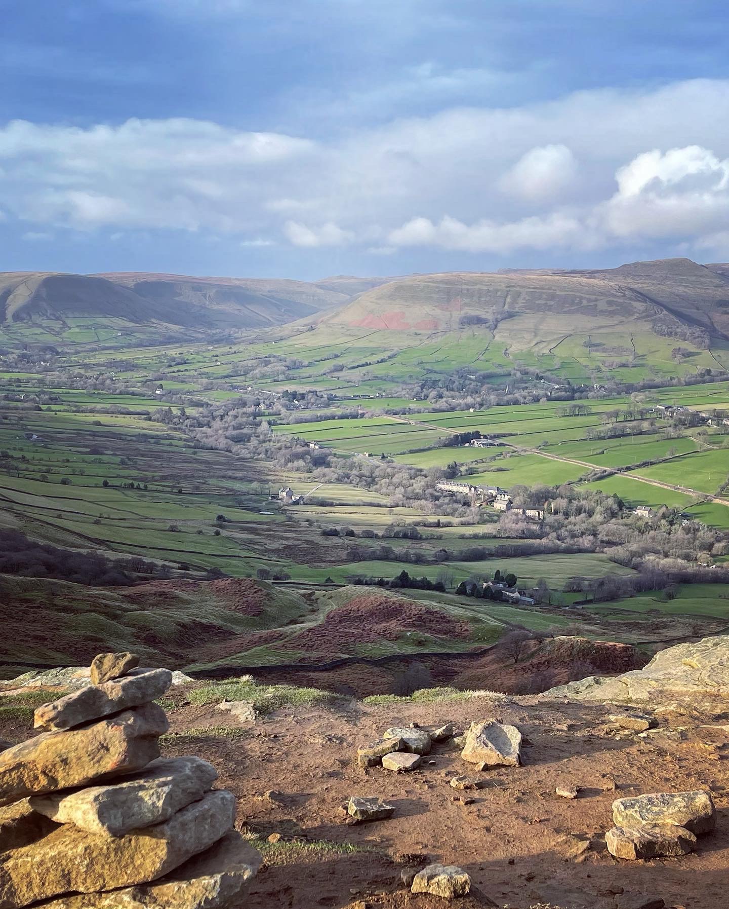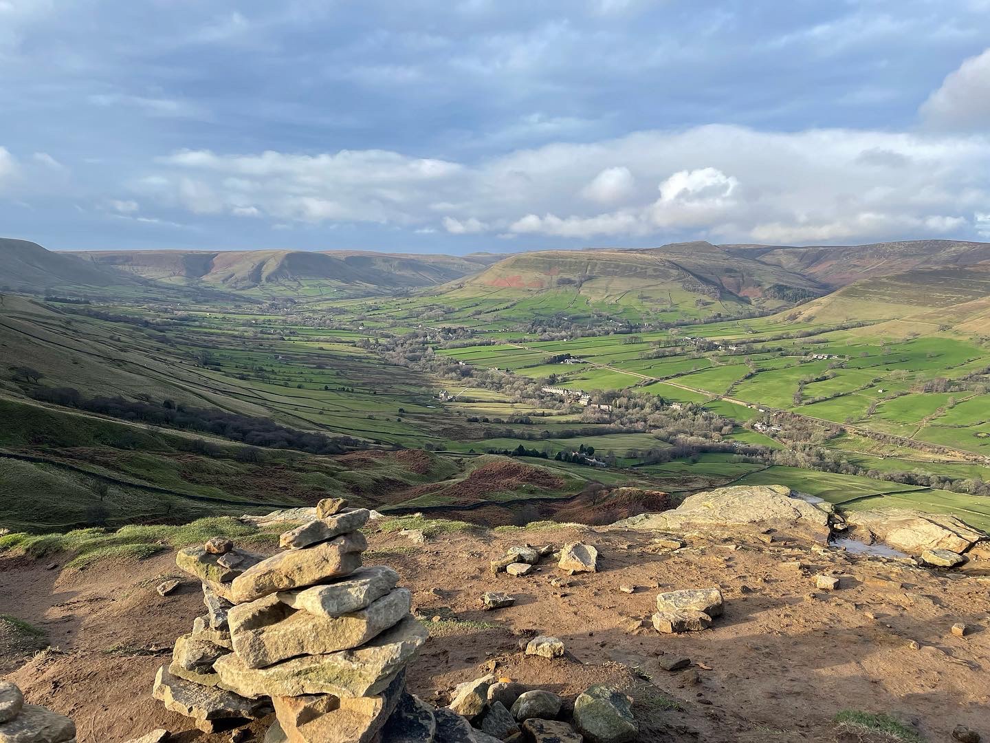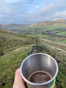 Taking a rest stop for hot chocolate and snacks upon reaching Hollins Cross, it seemed the perfect place to enjoy the views. We dropped down out of the wind and sat at the foot of a low drystone wall running right down into the Vale of Edale.