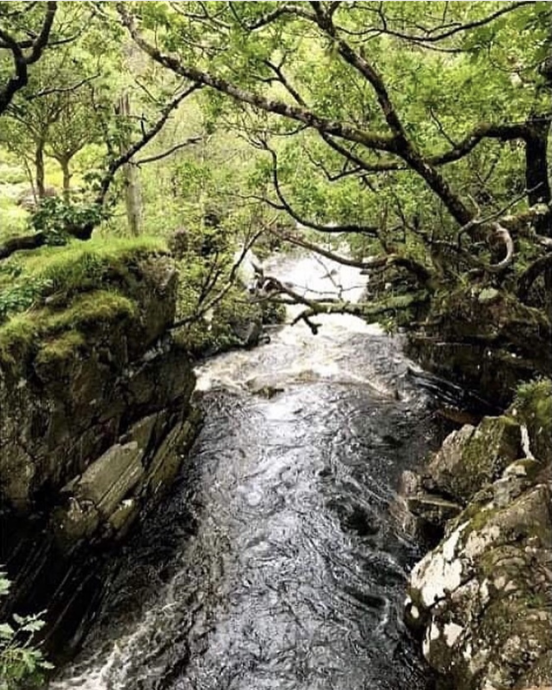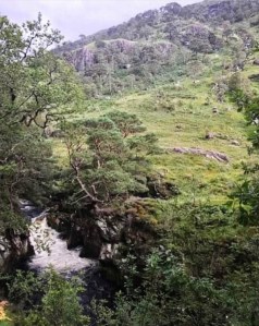 The footpath becomes a much easier walk from here on as the terrain consists more of mud path with fewer rockier sections. Leading down close to the waters edge, here is a great opportunity to view the waterfall from closeup. The banks of the river are shingle with wooded slopes and from this point there are several routes in which to cross the river if desired.