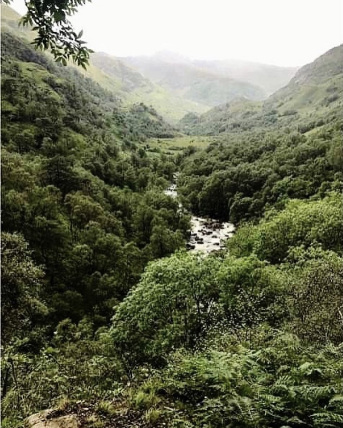 Following Glen Nevis Road, I took in the scenes around me. To my left was the mighty Ben Nevis which looked forbidding today in the dim light. It’s summit as usual couldn’t be seen, shrouded completely in thick grey mist which clung there like magnified steam. As I looked on, I remember feeling thankful that I wasn’t climbing up there today in this poor weather and knew that the Gods of hiking had truly been on my side yesterday morning. Along the foot of the mountain ran the wide River Nevis which weaved and twisted as it rushed over stones and round many corners on its way along the Glen. A large waterfall trickled down off the far side and eventually met up with the river. I crossed the road briefly to stand at a pretty parking space on a small hill to observe its cascades before continuing onwards.