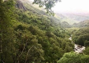 Following the path onwards I began to notice that I was heading into an open gorge. There are fewer trees here, the ones visible tending to cling close to the rocky crags and steep edges of the gorge itself. From where I now stood on the Steall Falls path, I could see the waterfall in the distance before me and even from way back here it was a spectacular sight.