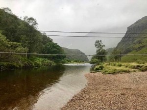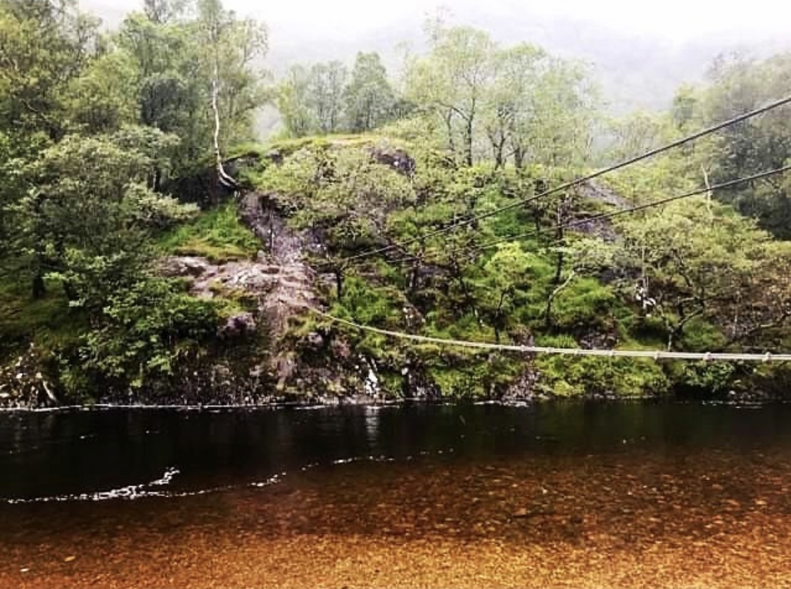 For the daring and adventurous soul, is probably my favourite river crossing of all, a large three wire bridge crossing the Water of Nevis to a mountain hut located in woodland at the base of the falls. The hut in particular has been used lots as a bothy and appears to be an interesting and cosy place to stay. However, although I visited the waters edge that day, I was so overcome with midges that it proved impossible to cross the bridge safely in order to visit the hut. At the time I was disappointed, but due to the nature of the bridge, the need to have your wits about you and the fact that you need both hands at all times, I knew on this occasion it would be too dangerous. I was forever having to slap away midges from my face as I literally felt that I was being eaten alive and at one stage, I passed a young woman whose face and hair was completely covered. I decided to save the wire bridge for another time and remained on the far bank of the Water of Nevis.