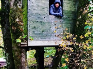 Looking around for a place to sit we headed towards a low stone wall just past the tuck shop but at that moment, Kye spotted the perfect place. An old wooden treehouse just to the side of the trail. It didn’t appear to be in a garden of any kind but I wasn’t sure if the land was private. I couldn’t believe our luck when the man working at the tuck shop said anyone can go in it. Despite the weather being fine that morning, there was definitely a nip in the air and a light dusting of frost in places. Grateful of a warm, dry place for breakfast, we headed to the rickety ladder and began the scramble through the trapdoor entrance into the treehouse.