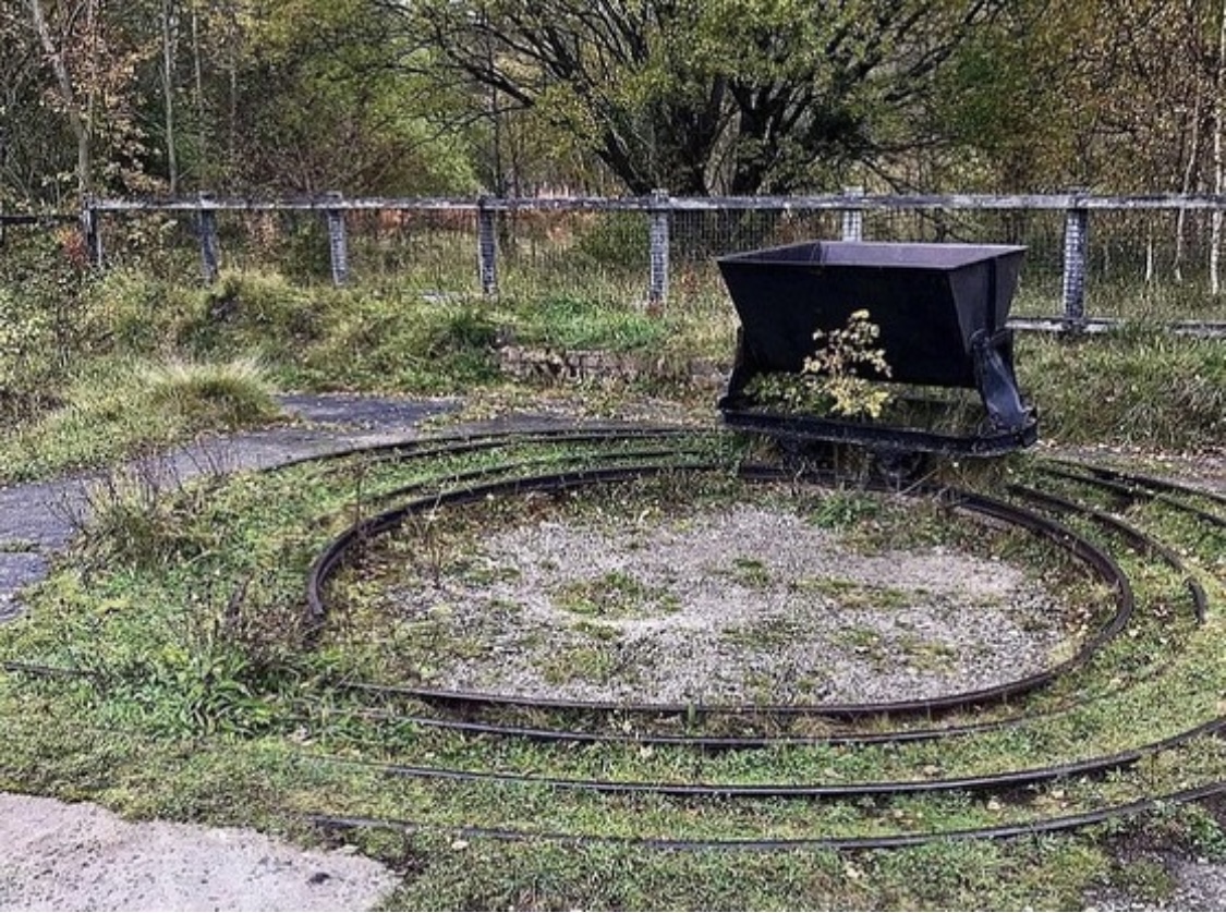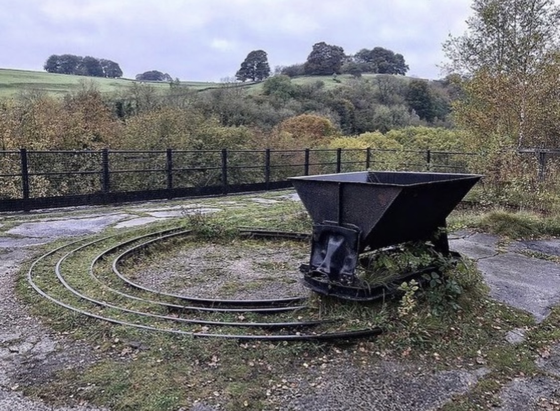 Upon arriving at the top we found that it led out onto the roof of the kiln itself which was fenced safely all around its perimeter by a black metal fence. Gazing down from the top, we could see that we were quite high up and views across the autumn tree tops were clear. There is not a great deal at the rooftop except an old railway carriage of the type used to transport the quicklime from the kiln many years ago. This was set on a circular railway track for decoration purposes.