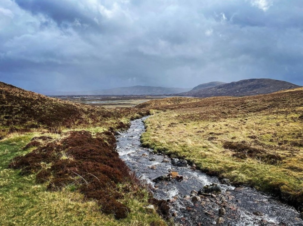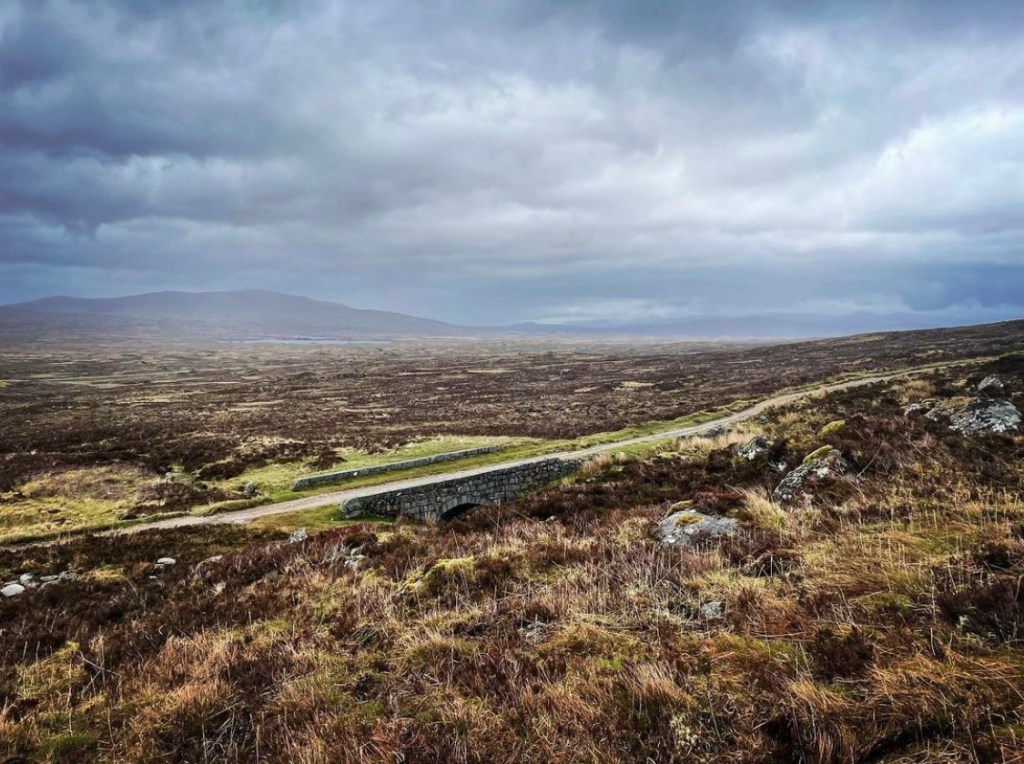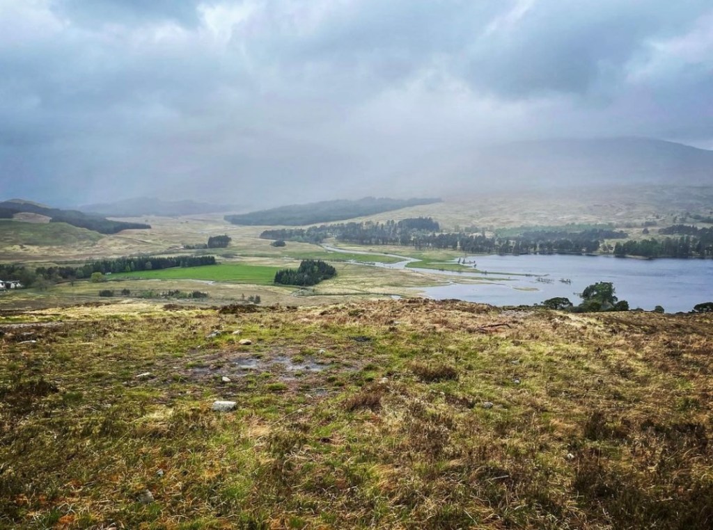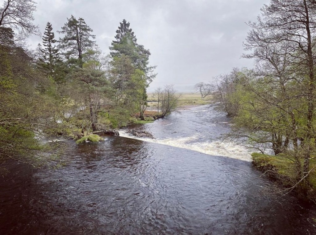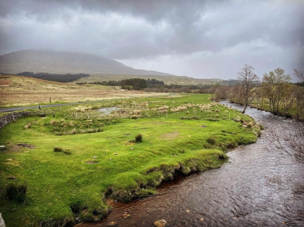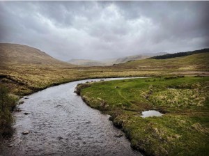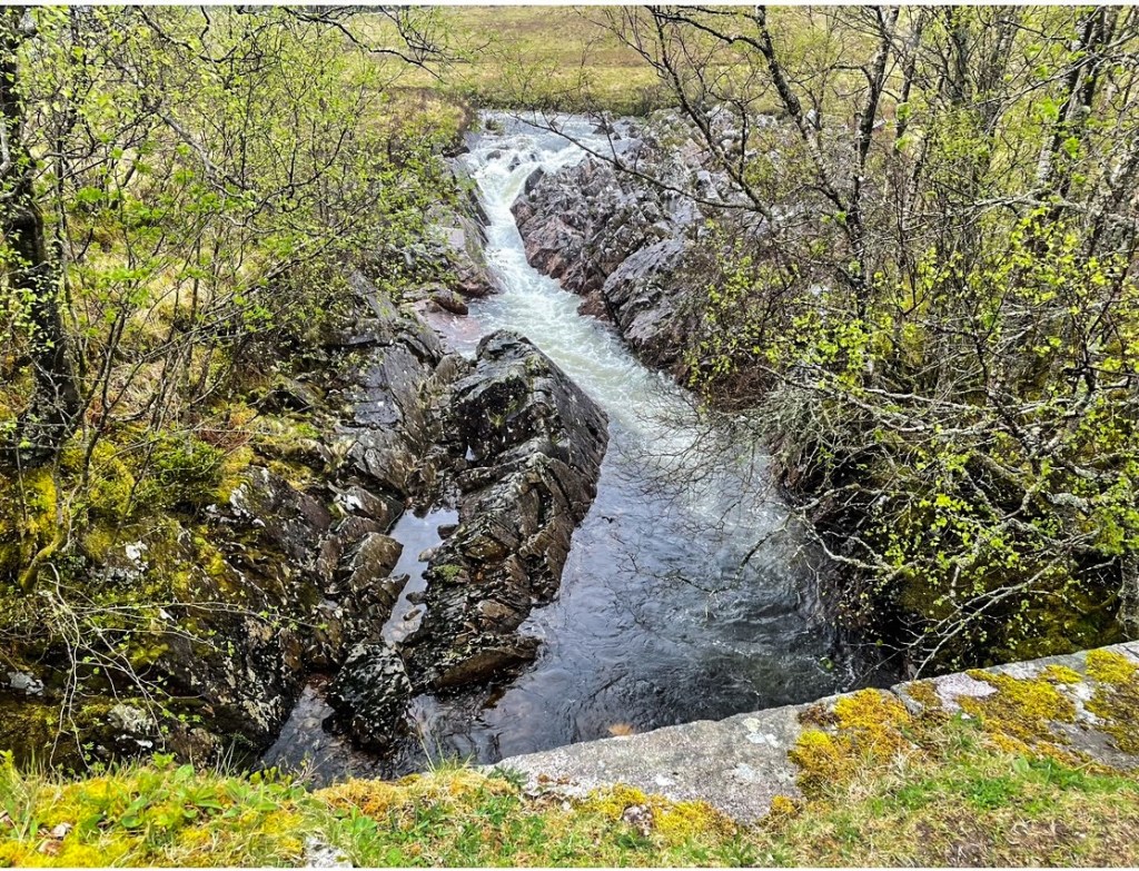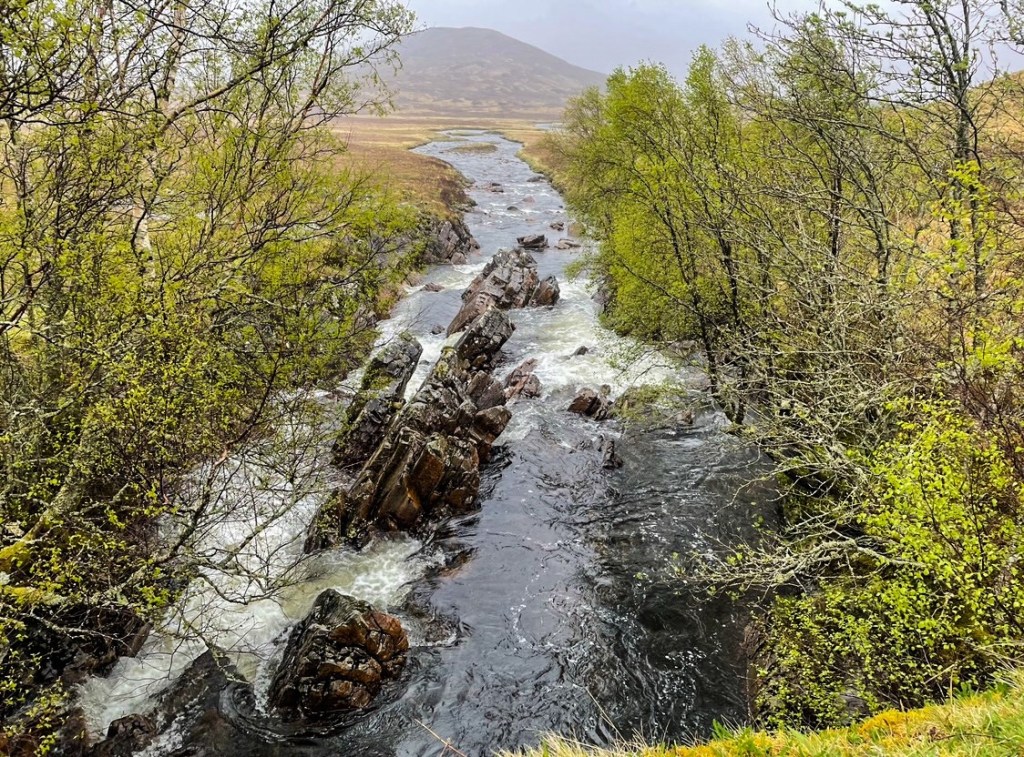Eventually I reached Ba Bridge where I removed my heavy rucksack from my shoulders and sat awhile in the pouring rain but out of the winds. It was really a calming moment as I stared downstream at the rushing waters travelling towards the rolling hills of Rannoch. I couldn’t help but marvel at the colours here as I sat shaded to a degree by the tiny copse of trees and thought I caught a hint of what I would’ve classed as autumnal back home in the Peak District. Rich browns, auburn and almost mahogany was the foliage which grew on these moors mixed in with the green grasses and plant life. It certainly felt autumnal despite being spring.
