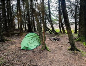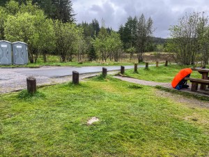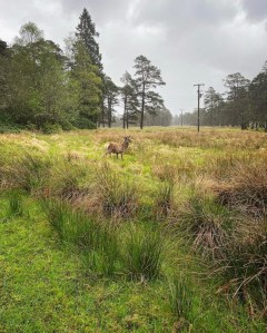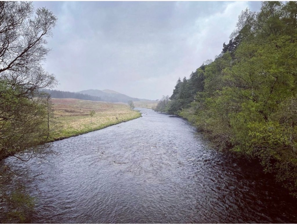 Considering my next move, the main priority was to find somewhere suitable to camp. The rain was still pounding down all around and the wind certainly had no let up. I considered pitching by the fast flowing river where I spotted 3 other tents already but looking at the condition of them I had second thoughts. They were getting totally buffed by the large gusts and didn’t look very sturdy. Then out of the corner of my eye, I spotted Alex, the soldier I had met in Doune Byre Bothy on day 3. After chatting with another fellow hiker, he began heading towards a patch of forest trees a short distance from the hotel. Shouldering my heavy pack once more, I headed over there.