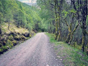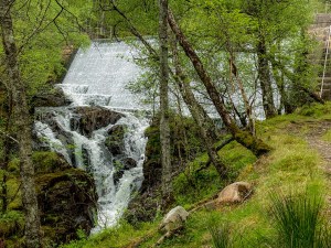 Further down, the landscape changes from open mountain tops to woodland which becomes gradually more dense and the road continues ever downhill. I did have the pleasure of resting at a beautiful flowing dam as I got closer to Kinlochlevan which really restored my faith in this section of the hike. I believe it came at just the right time as I was beginning to feel that this road would never end. Unfortunately, despite searching for the name of this beautiful waterfall and dam I have been unsuccessful at finding out its name. It was however stunning and very relaxing to sit at and watch.